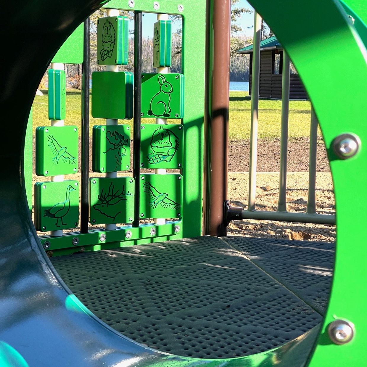 Accessible activities include a ramp with rails to an extra wide platform where a Canadian wildlife memory game, alphabet & number maze, steering wheel and a crawl tube can be enjoyed.