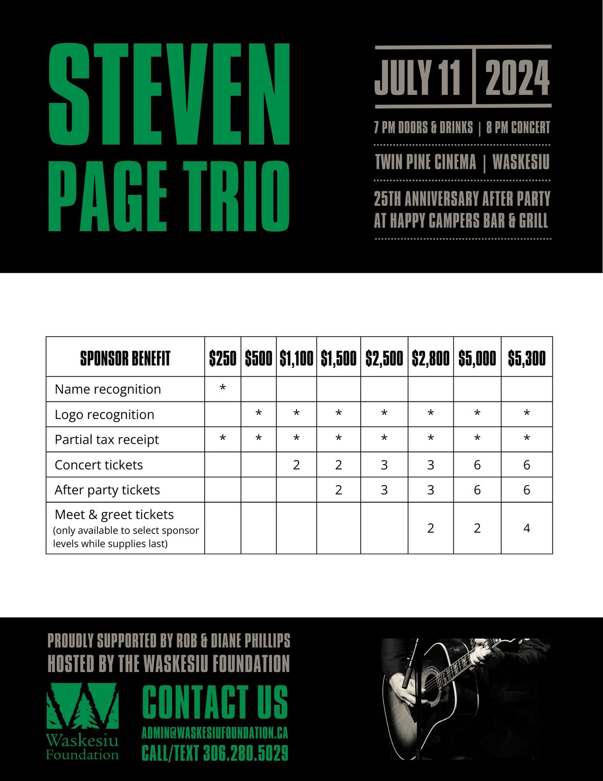 Meet & greet tickets with an invite to the pre-show sound check, an opportunity to meet Steven Page & have your photo taken, a signed size large Waskesiu t-shirt, plus the BEST seats in the house for sponsorships starting at the $2,800 level (limited availability while supplies last)
